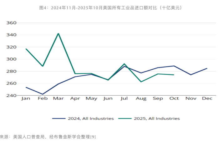 美国人口普查局截至2025年10月的货物进口数据显示,企业的“抢跑”行为在2024年底开始加速,2025年第一季度达峰。随着部分关税在4月和5月正式生效,进口激增的现象迅速消退,7月以后进口开始低于历史水平。