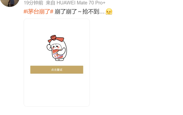 记者今日早间在i茅台app看到,9点时app可以正常登陆,但在点击进入抢购茅台的i购页面时,页面显示加载但迟迟无法打开,最终显示“点击重试”,多次刷新后也无法进入。在社交平台上,多位网友发出截图也出现类似情况,甚至网友发出疑问“i茅台的服务器瘫痪了?”到9点30分,页面恢复正常,但1499元茅台也显示已售罄。