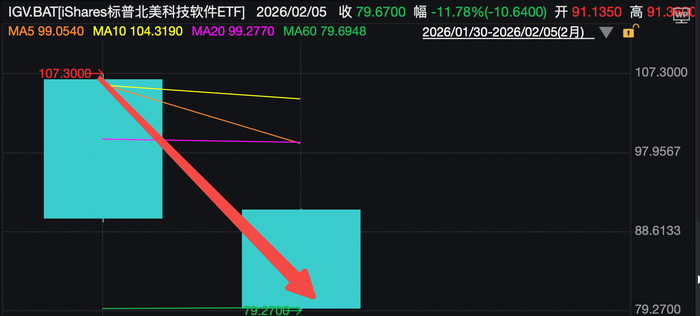 时间线上,自今年1月,AI 颠覆预期升温,软件板块开始走弱,标普北美科技软件指数(IGV )下跌约25.8%,头部软件公司Salesforce、ServiceNow、Adobe和Workday等股价持续走低,软件行业估值倍数出现剧烈压缩。