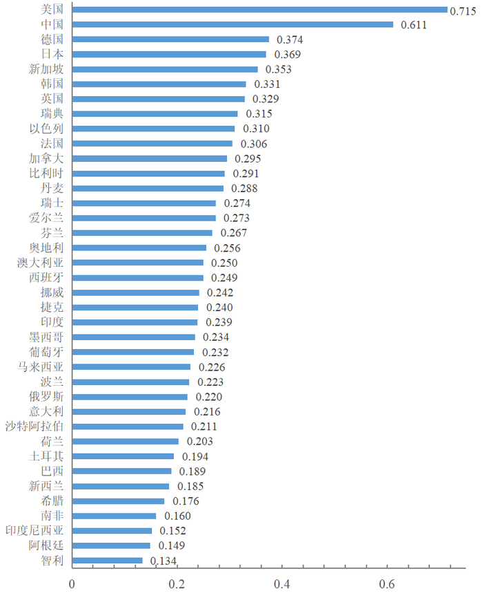 排名第11~17的加拿大、比利时、丹麦、瑞士、爱尔兰、芬兰、奥地利等7个欧美国家处于同一档次,属第二梯队,分值在0.25-0.3之间。排名第18~24的澳大利亚、西班牙、挪威、捷克、印度、墨西哥、葡萄牙等7国处于第三梯队,分值在0.23-0.24之间。排名第25~30的马来西亚、波兰、俄罗斯、意大利、沙特阿拉伯、荷兰等6国处于第四梯队,分值在0.2-0.22之间。排名第31~38的土耳其、巴西、新西兰、希腊、南非、印度尼西亚、阿根廷、智利为后8名,竞争力指数在0.13-0.2之间。后三个梯队各国的产业链韧性指数得分相差不大。但是,排名首位的美国的产业链韧性指数是排在末位的智利的5.4倍。
