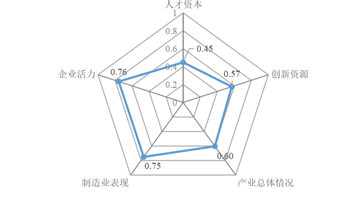 从国家产业链韧性指数总体排序看,中国排名第二,在美国之后,与中国的经济体量在世界上的位置相当。从各个指标得分来看,以单项满分为1计算,中国在企业活力表现方面得分最高,得分为0.76;其次为制造业表现,得分为0.75,然后是产业总体情况(0.60)、创新资源(0.57)、人才资本(0.45)。从各个一级指标的排序来看,制造业表现指标排第一,产业总体情况、企业活力以及创新资源均排第二,人力资本排第七。