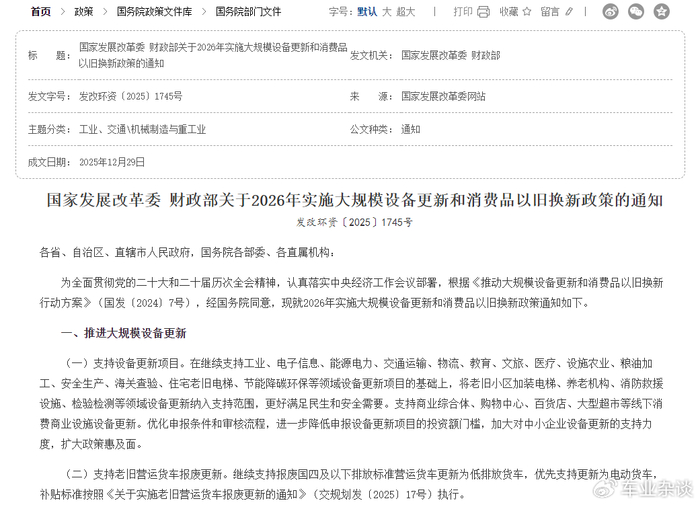 12月30日,国家发改委、财政部印发《关于2026年实施大规模设备更新和消费品以旧换新政策的通知》,明确汽车新国补细则,补贴如期而至。