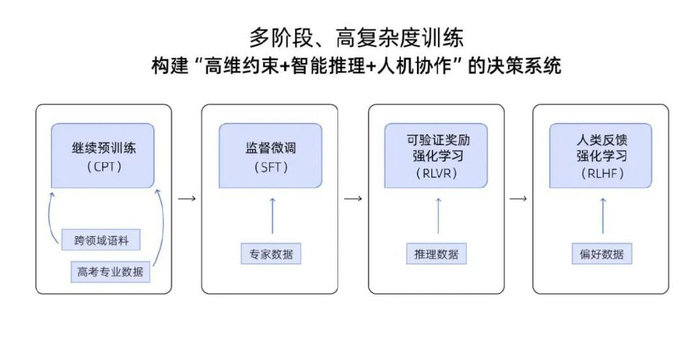 要实现这一目标,夸克首先要让 AI 学会模仿真人专家的「思维链」。在指令微调阶段,研发团队将数百名资深高考志愿规划师与考生、家长的多轮真实对话进行结构化处理,提炼出完整的分析路径与沟通语言风格。这些包含了上万条真实专家「推理链」的高质量监督数据,成为大模型学习人类专家分析过程的「教材」。