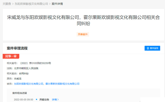 据媒体报道,宋威龙与东阳欢娱影视文化有限公司,霍尔果斯欢娱影视文化有限公司相关合同纠纷新增开庭公告,原告为宋威龙,被告为东阳欢娱影视文化有限公司,霍尔果斯欢娱影视文化有限公司,经办法院为北京市朝阳区人民法院。