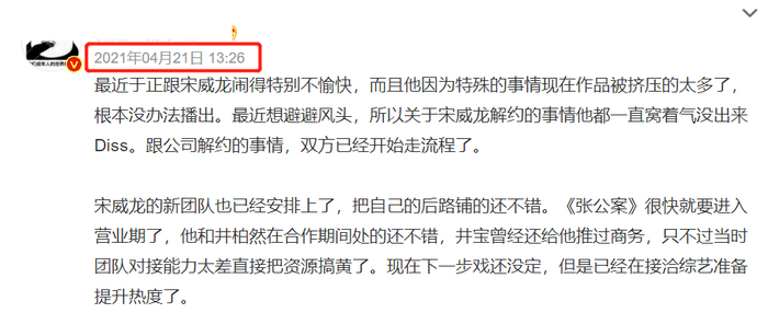 没想到两人这么快就闹翻了。关于闹掰的原因,其实去年4月就有知情人透露,两人闹得很不愉快,于正因为特殊原因,很多作品无法播出,宋威龙又闹起解约,当时两人已经开始走流程了。而宋威龙也早已给自己铺路,组织了新团队。