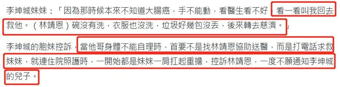 李坤城妹妹就透露,哥哥从来不让林靖恩操心,生病了也是跟自己求助,林靖恩不会洗碗不会打包垃圾,日常就是玩电动游戏。