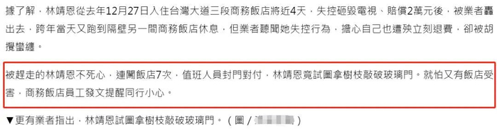 明知酒店报警了,林靖恩还是反复纠缠,连闯酒店7次,拔掉大厅装饰、在骑楼吐痰,还试图拿树枝敲破玻璃门。