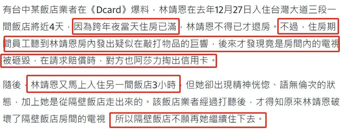 被酒店赶出来之后,林靖恩又找一家酒店入住,结果因为她举止异常,另一家酒店得知她的打砸行为之后再次要求她离店。