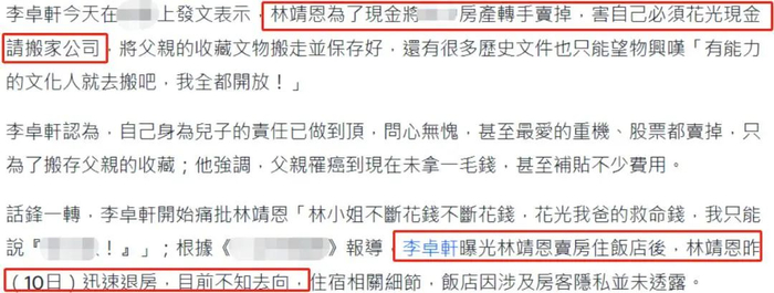 ——李坤城一去世,林靖恩就和继子因争产闹了矛盾,她直接卖掉了丈夫留给他的遗产,玩起了失联,继子一开始还关心林靖恩的下落,得知她居无定所辗转在各个酒店之后很是不满,认为她只会乱花钱。