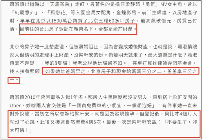据悉,北京的房子她一度想处理,但被母亲阻止,因为会变成婚后财产。也就是说,萧淑慎跟家人在处理手上财产很谨慎,没梁轩安的份。如果她比爸妈早走,北京房子和现金给妈妈三分之二,爸爸拿三分之一,还是没有老公的份。