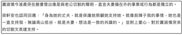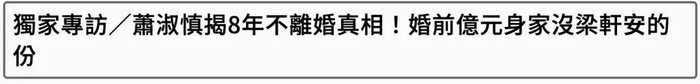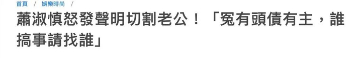 据悉,梁轩安结婚这8年来真是让萧淑慎操了不少心,先是涉及诈骗,后来又被女子指控骗财骗色、女歌手Rina指控性侵。在今年三月份的时候,萧淑慎甚至直接发文与老公切割关系:冤有头债有主,谁搞事就去找谁,让不少人以为萧淑慎要与老公离婚。