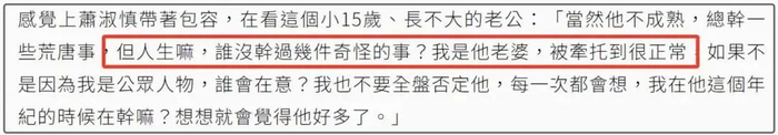 萧淑慎比丈夫大了15岁,在她看来丈夫还是不成熟的,总干一些荒唐事,但萧淑慎又自我安慰般地表示:“人生嘛,谁没干过几件奇怪的事?我是他老婆,被牵扯到很正常,如果不是因为我是公众人物,谁会在意?我也不要全盘否定他,每一次都会想,我在他这个年纪的时候在干嘛?想想就会觉得他好多了。”