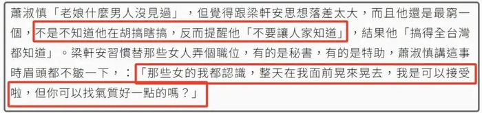 但结婚后梁轩安总是乱搞男女关系,萧淑慎首次坦言自己知道老公在乱搞瞎搞,但也只是提醒他“不要让人家知道”,没想到后来老公“搞得全台湾省都知道”。更离谱的是,那些女的萧淑慎都认识,还说整天在她面前晃来晃去,萧淑慎还对这些女生评头论足,称这些情人气质很一般,还觉得她老公应该找气质好点的,令人一言难尽。