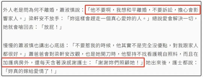 一边说爱老婆,一边又在外面乱搞,这样的丈夫估计也只有萧淑慎能接受了。在她看来丈夫也有优点,比如当时自己做手术的时候梁轩安坚持不找看护亲自照料,而且在加护病房外,每天含泪感谢护士:“谢谢你们照顾她!”就连护士都说萧淑慎真的嫁给爱情了……