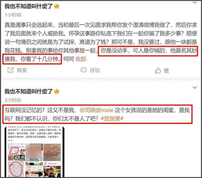屈楚萧前女友爆料当年细节,称她是被屈楚萧叫来的朋友打的,屈楚萧在一边看了十几分钟,而司晓迪爆料的所谓闺蜜,似乎是当年爆料屈楚萧有特殊癖好、PUA的那一个。