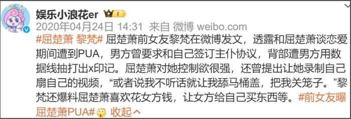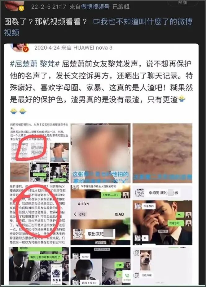屈楚萧前任还爆料当时自己被屈楚萧朋友打了之后,屈楚萧还求她别报警,说“他不能再有负面消息了”。