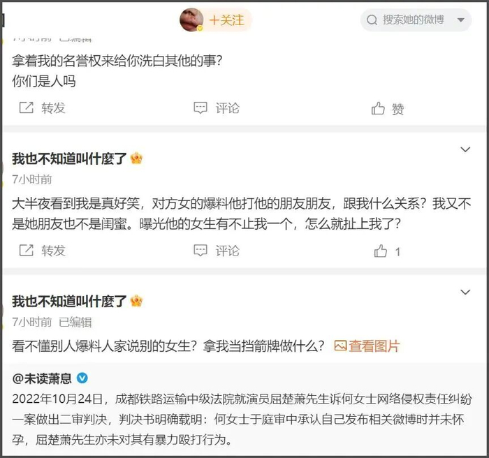 还有粉丝维护屈楚萧,说屈楚萧手里捏着胜诉书没公布,挨了3年的冤枉骂名,但胜诉的事件和司晓迪爆料的不是同一个吧?