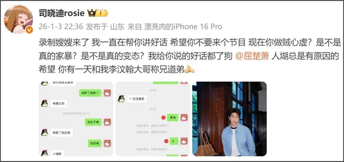 2026开年内娱热搜就“爆”了,司晓迪持续爆料了一天一夜,牵扯十多位男星,其中就有屈楚萧。屈楚萧工作室对此做出回应,称屈楚萧和某自媒体用户不存在任何网络捏造传播的关系,但并没点名司晓迪。