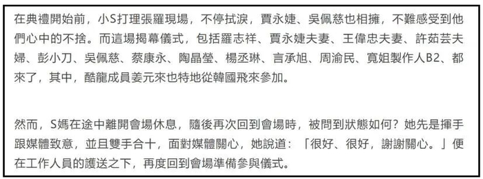 ——S家面对大S离世,走出悲伤并不容易,一年还是太短了,所以再等等看吧,第二年、第三年……乃至十年八年,时间能够冲淡一切,亦能证明一切。