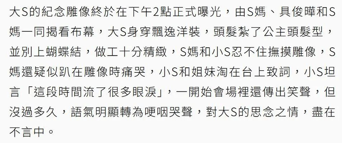 ——大S的雕像形象也是让人意想不到,看上去还是小孩子,闭着双眼、双手交叠放在身前,像是感受着微风,配合头上的蝴蝶结,纯真又肆意。不过有网友觉得不太像大S,而且眼睛还是闭着的。