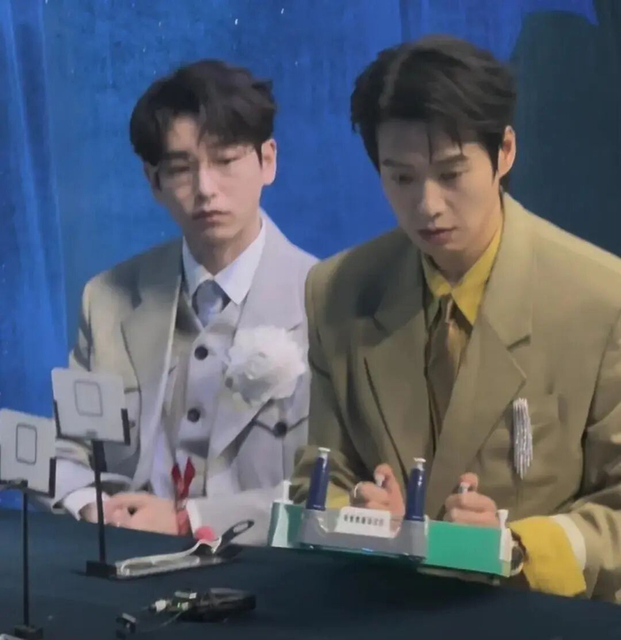 众所周知,娱乐圈是一个熟人抱团的地方,从明星们在后台的社交就能看出谁和谁更熟。魏大勋和彭昱畅是多年好友,在大家都忙着社交的时候,他们俩坐在后台一角彼此作伴,悠闲地玩起了桌面投篮的游戏。