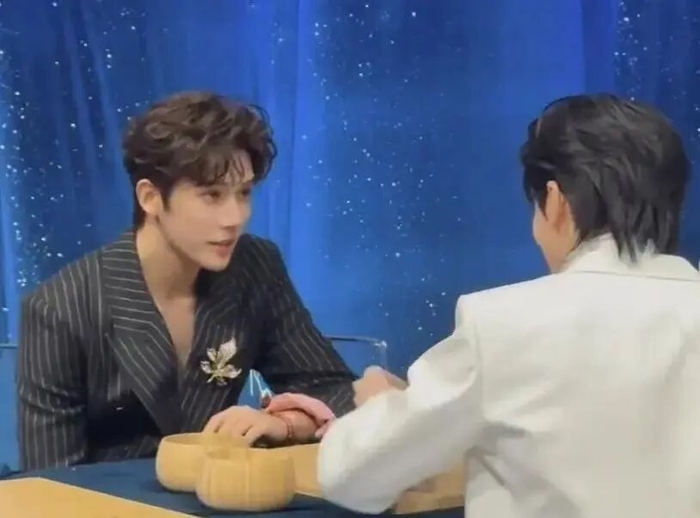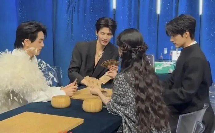 曾舜晞先是和程潇热聊,之后又和周也用纸挡着脸凑在一起聊天。聊天聊得尽兴了,曾舜晞又跑去和王安宇下棋。下棋下得尽兴了,曾舜晞又和周也、张凌赫、周柯宇一起打牌。不得不说,曾舜晞在社交名利场中真是表现得游刃有余啊。