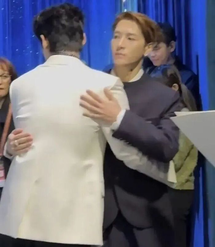 另一边,《镖人》剧组上演了一番“师徒情深”。正在后台候场的谢霆锋听见工作人员提醒他“师父来了”之后,立刻向着正在走来的吴京迎了过去,给了对方一个大大的拥抱。