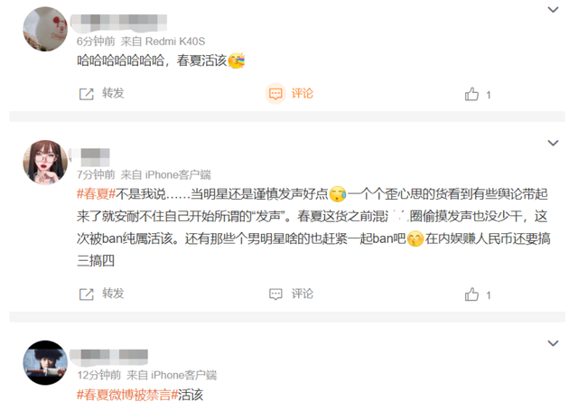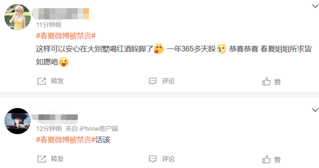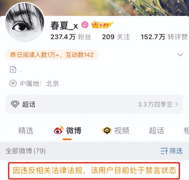 经历了晚会删减、电影宣传除名,关键时刻发表了不当言论的30岁女星春夏终于被禁言了。