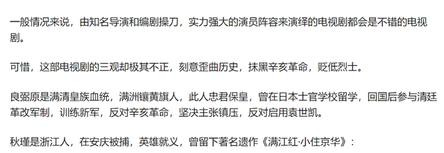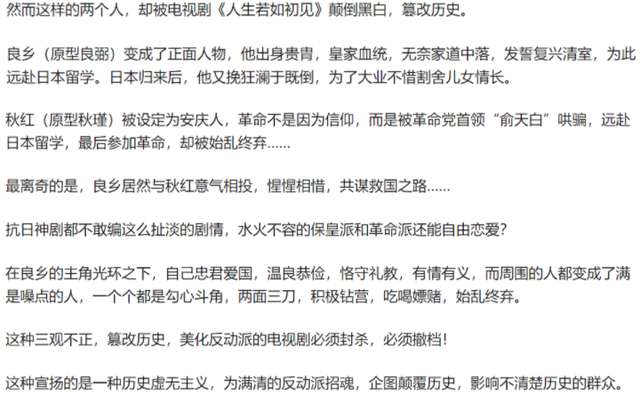 譬如电视剧《人生若如初见》,春夏饰演女主,原型是巾帼英雄秋瑾女士,整部剧涉嫌洗白保皇党、污蔑烈士,强行上线播出惹众怒,最后直接下架。
