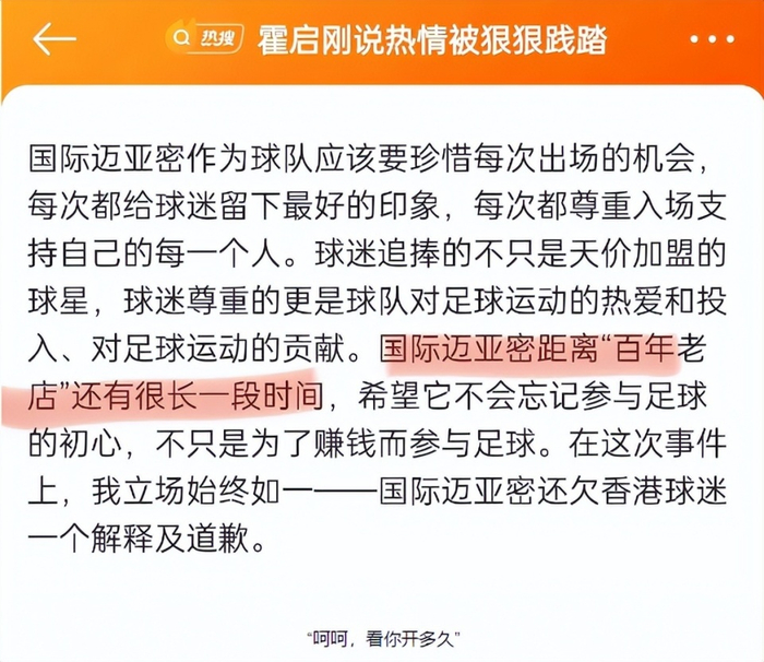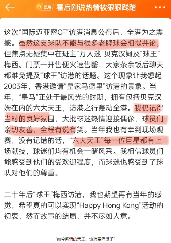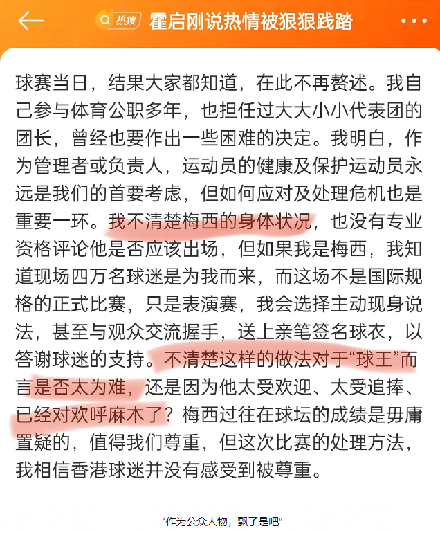 在中国香港负责文娱工作的霍启刚再次发文谴责梅西和他所在足球俱乐部迈阿密国际,话里话外意思很明显了,网友们也都看出了弦外之音。