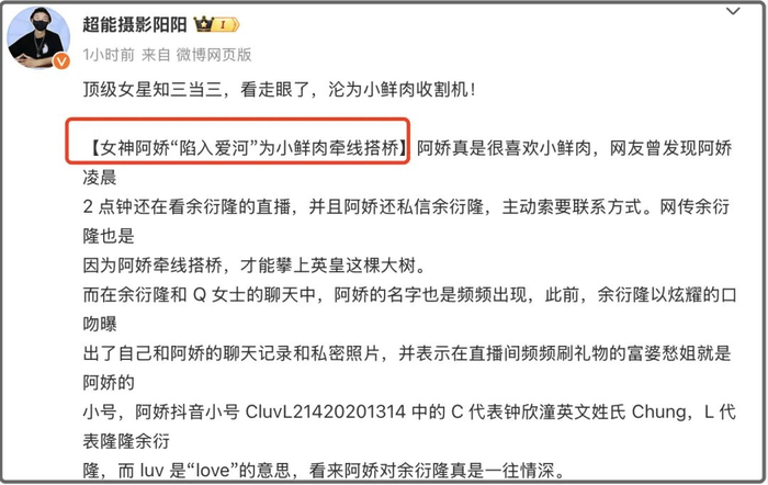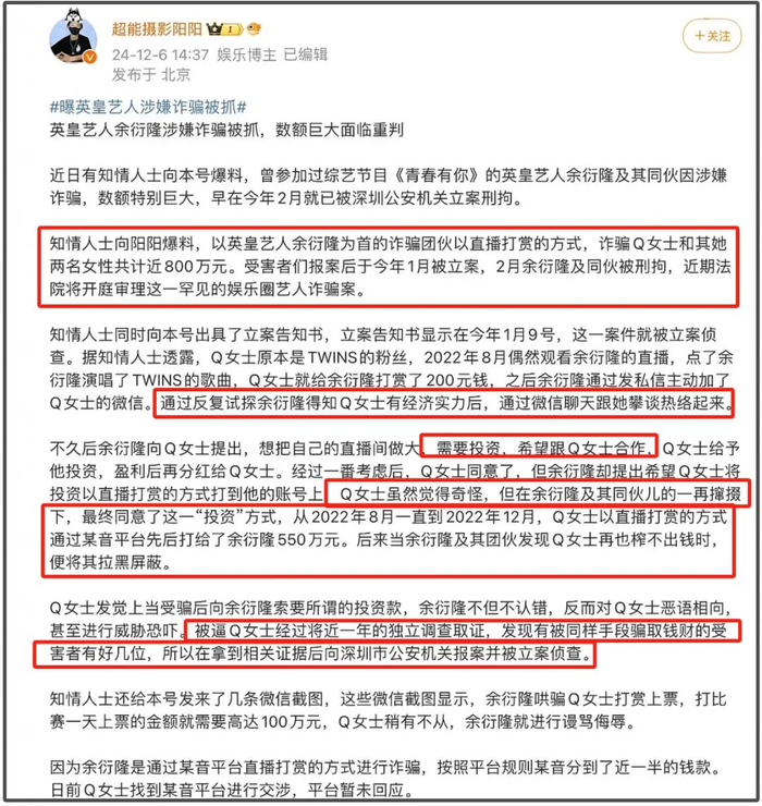 之前余衍隆一直是在做直播,期间还认识了另一位榜一大姐Q女士,并且忽悠Q女士给自己投资,说要将直播事业做大做强,要求Q女士通过直播打赏的形式,将投资款转移到自己账号,结果事后Q女士发现自己被骗,要求追回投资款被拒,然后她直接报警了。余衍隆如今也因涉嫌诈骗被警方刑拘调查,在他直播的那段时间里,余衍隆将自己和阿娇的故事告诉给了Q女士,这才有了所谓的知三当三的瓜。