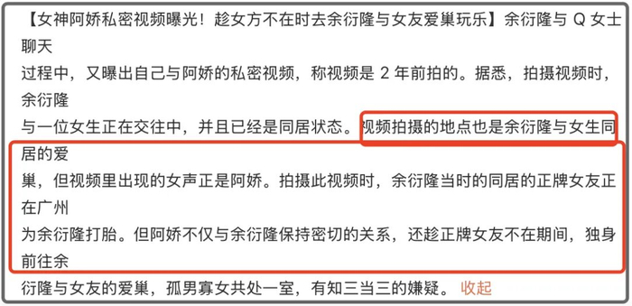 但是拍摄地点就很有意思了,余衍隆在的这个屋子,其实是和正牌女友同居的爱巢,此时正牌女友正在广州为他打胎,而阿娇就在这个时间段,与余衍隆同处一室过夜,这操作想想都觉得逆天。