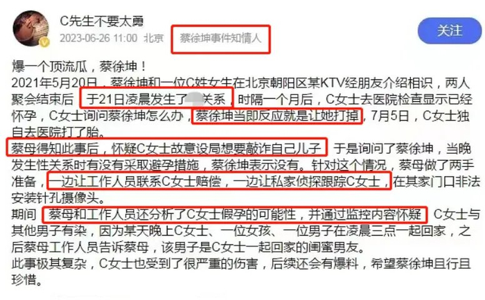 回顾当年蔡徐坤闹得满城风雨的绯闻,有知情人爆料蔡徐坤与一女生相识后发生关系并且导致对方怀孕,并且还让女方打胎。