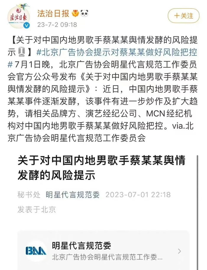 紧接着,官方与社会各界纷纷下场,删除蔡徐坤的所有相关报道,并且还针对当时蔡徐坤舆情发酵做出了风险提示,也就是说,从这一刻开始,蔡徐坤就被钉上了塌房艺人的头衔。