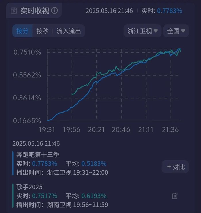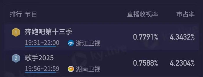 除了全员被吐槽难听,从收视反馈看,《歌手2025》8位首发歌手到底还是吸引力不足,所有人都唱完了,收视还没破1%,甚至还被《奔跑吧》反超了。
