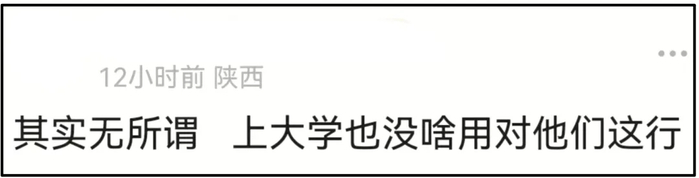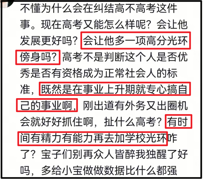 甚至已经有粉丝认为高考对于明星来说不重要,认为高考不是检验一个人是否优秀的标准,还把上大学看成是“人设光环”。毕竟明星不用上大学也有资源,也能拍戏录节目,等后面有时间了再去加“学校光环”。