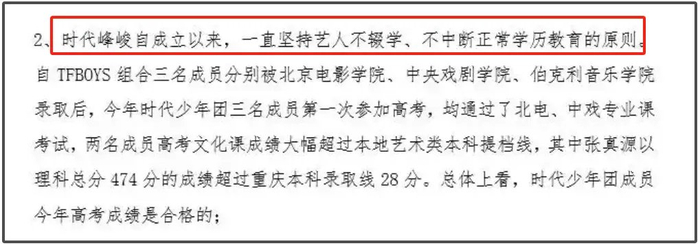 时代峰峻这几年最出名的就是“养成系男团”,旗下练习生大多都是还在上初高中的年纪,初代养成系男团TFBOYS都考上了大学,后来马嘉祺高考失利,时代峰峻还发声明表示坚持艺人不辍学、不中断正常学历教育的原则。