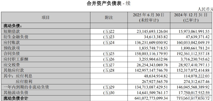 其中有息负债3,642.6亿元,占总资产的比例为30.5%。一年内到期的有息负债1,553.7亿元,占比42.7%;一年以上有息负债2,088.9亿元,占比57.3%。