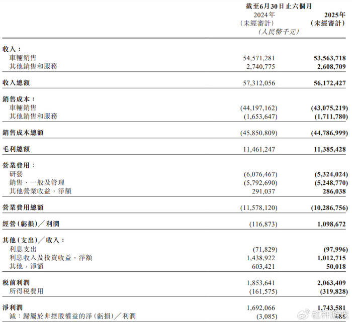 这也是理想汽车上市后中期营收首次下滑。不过利润增速保住了,上半年同比上升3%为17.43亿元。
