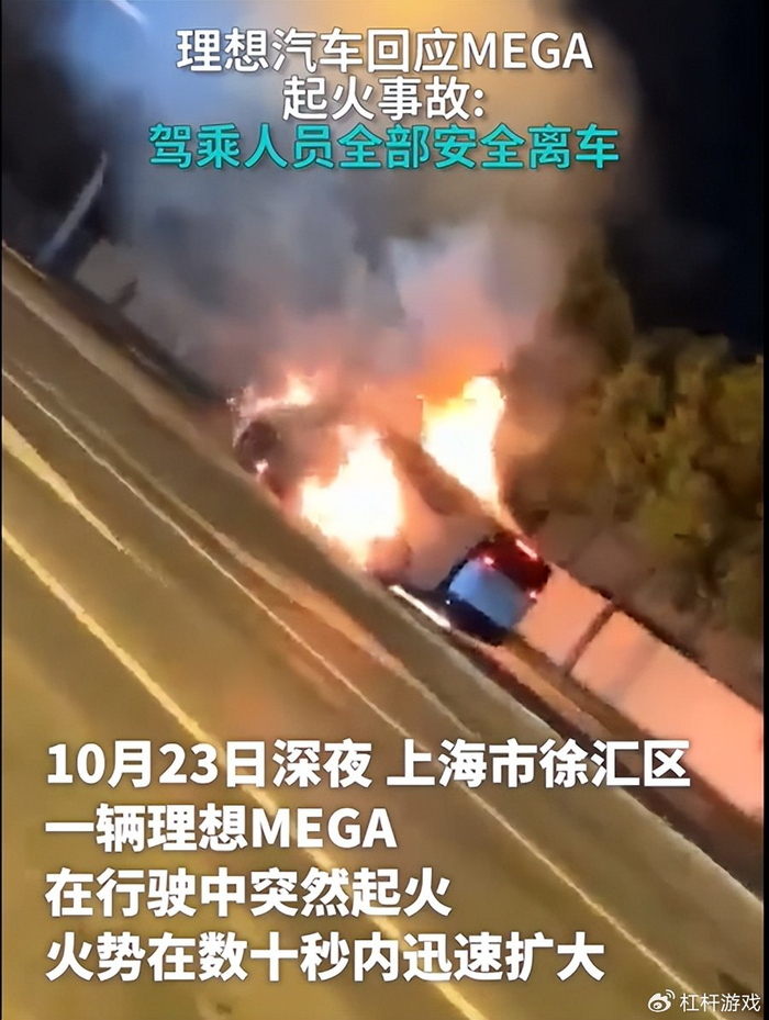 10月24日,一则“理想汽车MEGA起火”的视频在网络流传,引发关注。视频显示,10月23日晚,上海市徐汇区一辆理想MEGA在行驶途中突然起火。