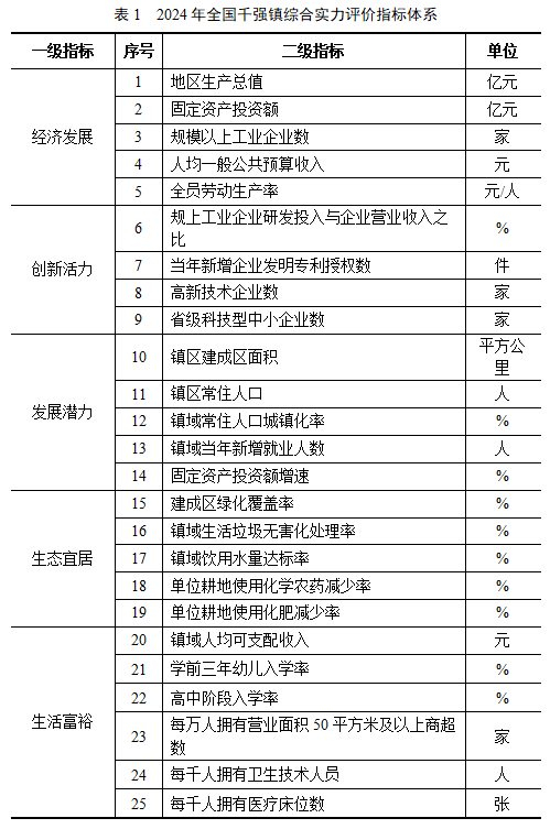 建制镇是中小城市下辖的行政单元,镇域经济是中小城市经济的重要组成。新时期推进镇域经济高质量发展,对于缩小城乡差距、区域差距、收入差距,进而实现全体人民共同富裕具有重要意义。该报告通过经济发展、创新活力、发展潜力、生态宜居、生活富裕5个一级指标和25个二级指标评选出2024年全国千强镇。