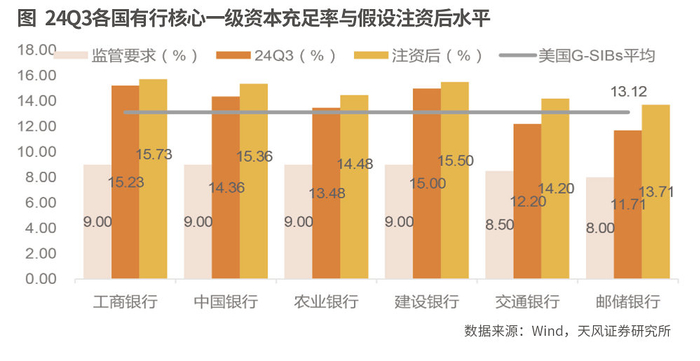 当前,中国G-SIBs现行资本充足率已高于监管规定,且仍有注资补充计划。在高于监管要求的基础上,国有大行注资补充核心一级资本工作正按计划进行。2024年9月24日,金融监管总局在国新办发布会上提出为国有大型商业银行补充核心一级资本计划,定增将按照“统筹推进、分期分批、一行一策”的思路有序实施。10月12日,财政部国新办发布会提到,将发行特别国债支持国有大行核心一级资本补充工作,提升抵御风险和信贷投放能力;财政部已会同有关金融管理部门成立跨部门工作协调机制,为各家国有大型 商业银行加快完成相关工作提供高效服务。
