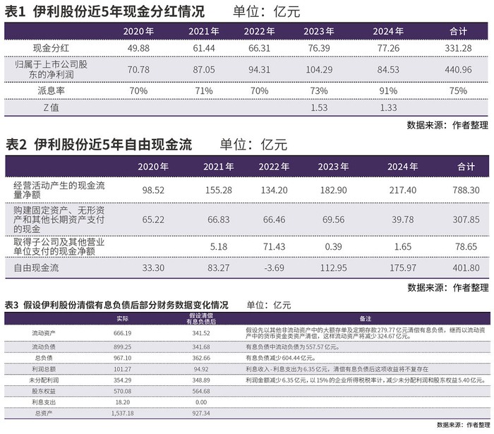 清偿全部有息负债后,伊利股份的资产负债率将降至39.11%,流动比率将升至1.00,Z值将升至2.54。看到这样的财务指标,投资者将不再会担心公司的财务安全问题。