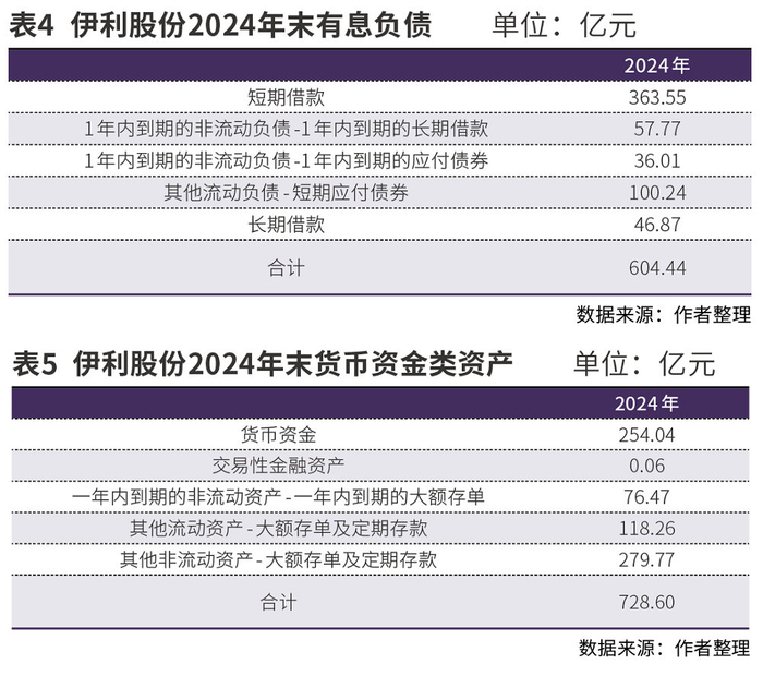 伊利股份的资产负债率高,且负债主要为有息负债。公司年报中披露2024年末有息负债为605.58亿元,我根据报表附注等整理出的数据为604.44亿元。要知道,伊利股份总负债为967.10亿元,也就是说,有息负债占了62.50%。这个比重相当高了,有兴趣的读者不妨和其他高分红的公司做个比较。