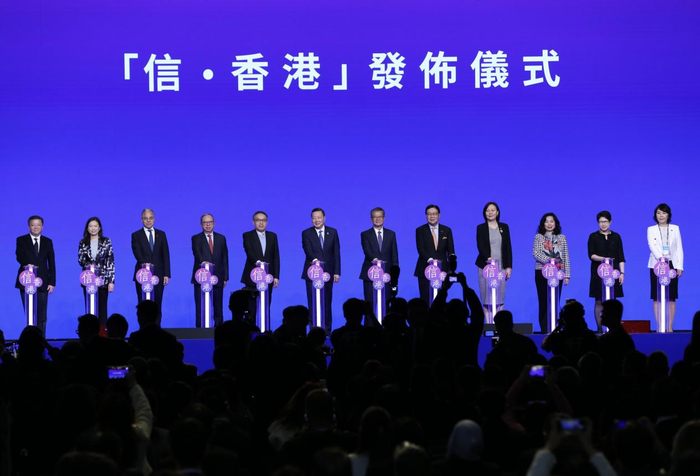 全球产业峰会期间,中信集团举办“信·香港”发布仪式,张文武、曾琪、鲍建敏与香港财政司司长陈茂波、香港财经事务及库务局局长许正宇、香港贸易发展局主席马时亨、香港旅游发展局主席林建岳等嘉宾共同上台,发布“信·香港”品牌。
