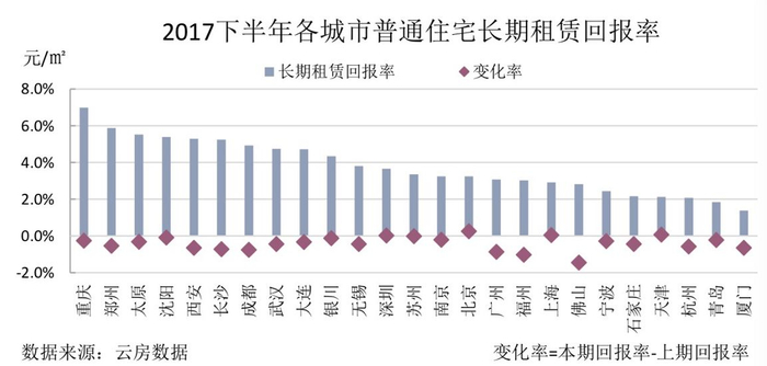 数据显示,短期内租金涨幅不及价格涨幅,过高的投资成本也致使长期租赁回报率呈现下行局面。2017下半年各城市普通住宅长期租赁回报率的排名中,前十名分别是重庆、郑州、太原、沈阳、西安、长沙、成都、武汉、大连、银川。