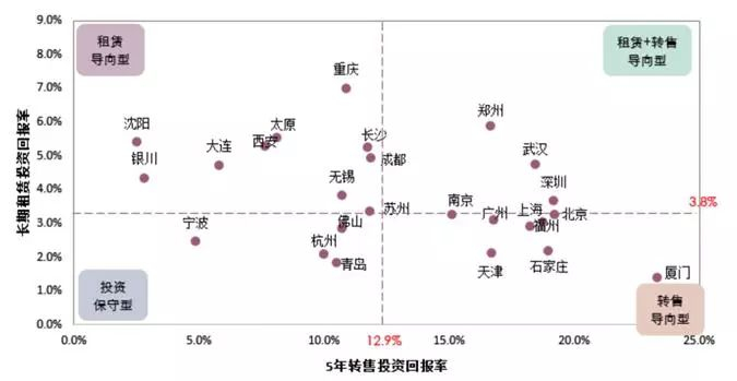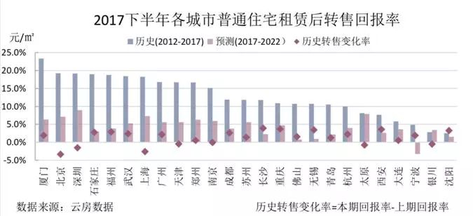 《报告》显示,各城市历史(2012—2017)普通住宅租赁后转售回报率前十名是厦门、北京、深圳、石家庄、福州、武汉、上海、广州、天津、郑州。