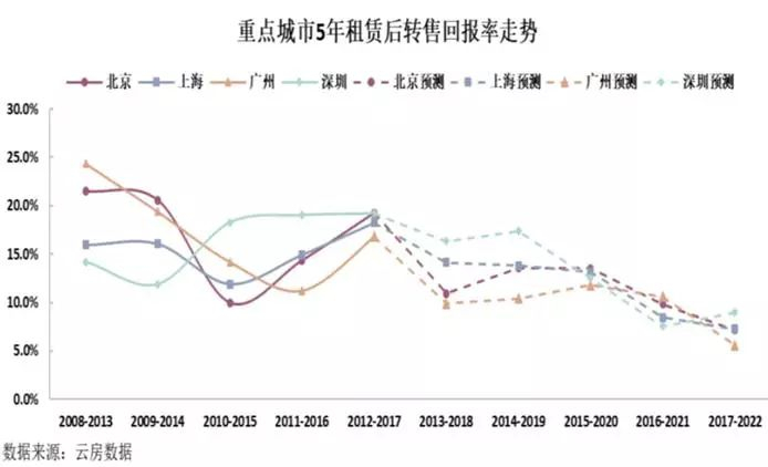 而在云房预测的2017—2022的各城市普通住宅租赁后转售回报率中,深圳、太原、北京、上海占据前四名。