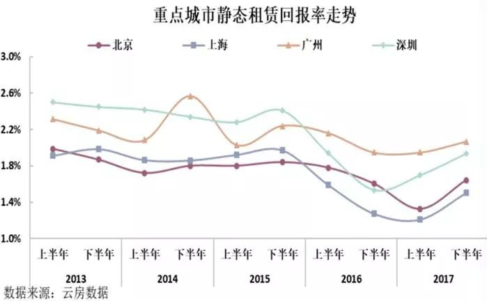 在静态租赁方面, 2017年,一线城市价格在整体环境收紧的基调下,价格环比涨幅下降,同比涨幅收窄;然而,今年政府大力促进租赁市场平稳发展,租金表现平稳,因此,2017下半年,北上广深静态回报率均上行。