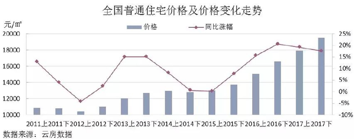 而这份来自云房数据的《报告》提出, 2017下半年,全国普通住宅的价格同比涨幅出现收窄态势,全国普通住宅同比上涨18%,与上半年相比涨幅收窄1个百分点。 十九大再度强调“房子是用来住的,不是用来炒的”,短期内,楼市调控政策不会出现宽松迹象,价格上涨动力不足,价格涨幅或将继续收窄。